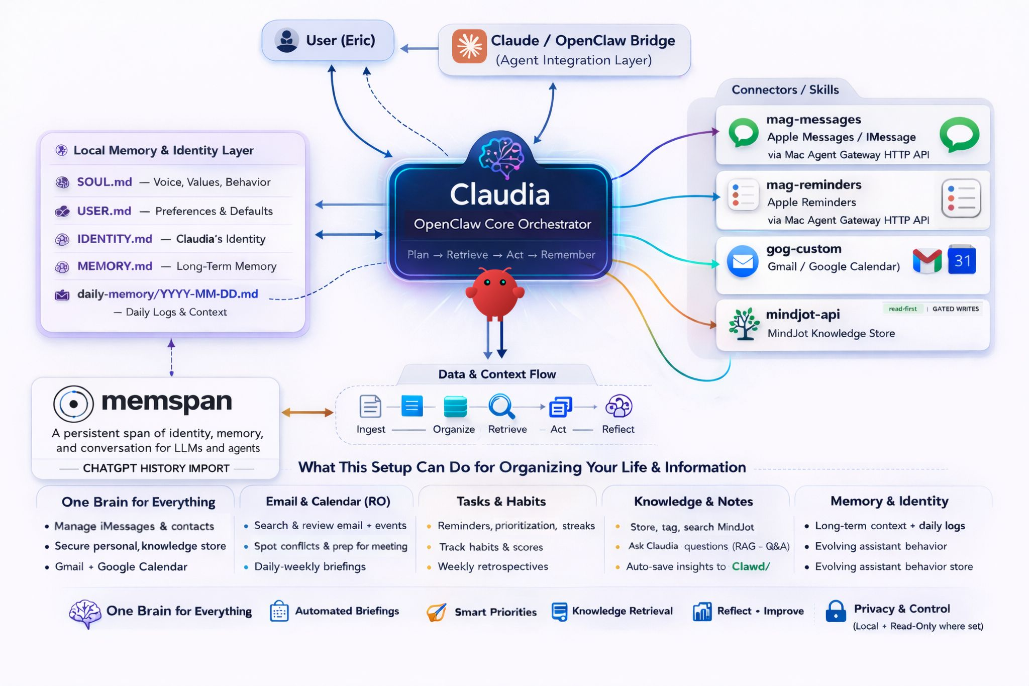 • Local memory + identity layer (SOUL.md, USER.md, long-term memory)